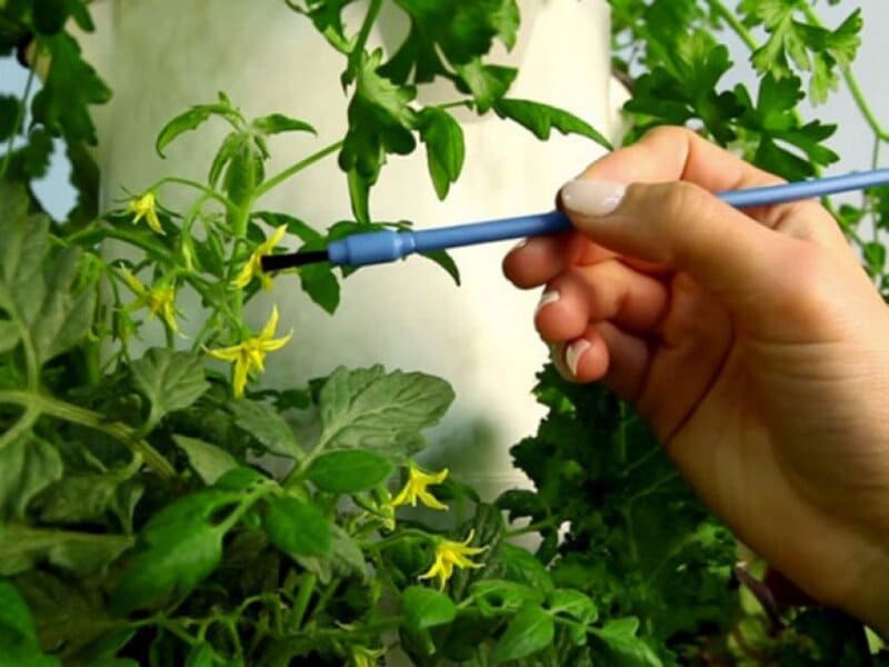 Nejjednodušší způsob, jak uměle opylovat rajčata ve skleníku, je zapnout ventilátor a projít se mezi rostlinami. K ručnímu přesunu pylu z jedné květiny na druhou můžete použít také štětce.