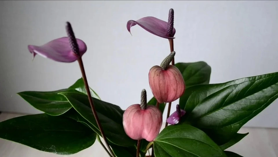 Anthurium má barevná květenství – voskový „okvětní lístek“ se ovíjí kolem cibule. Odstíny jsou rozmanité: krémová, růžová, žlutá, červená, světle zelená, vícebarevná.